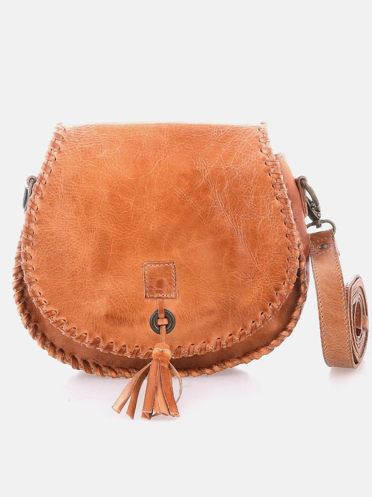 - Saddle bag shaped crossbody with playful leather tassel threaded through a metal grommet