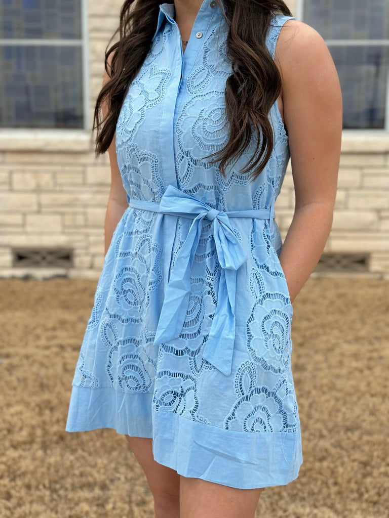 The Entro Woven Collared Mini Dress in Blue combines a solid sleeveless design with a floral lace overlay, enhancing its aesthetic appeal. Made from 100% lightweight cotton, this non-sheer dress features a self-tie belt for a customizable fit and a button closure for added convenience. Ideal for warm weather, its lining ensures comfort during wear.