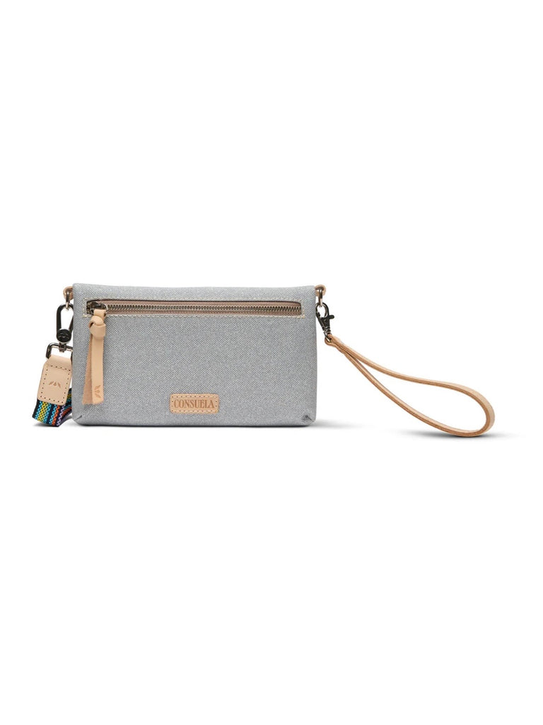 - Included detachable wristlet strap and adjustable woven crossbody strap