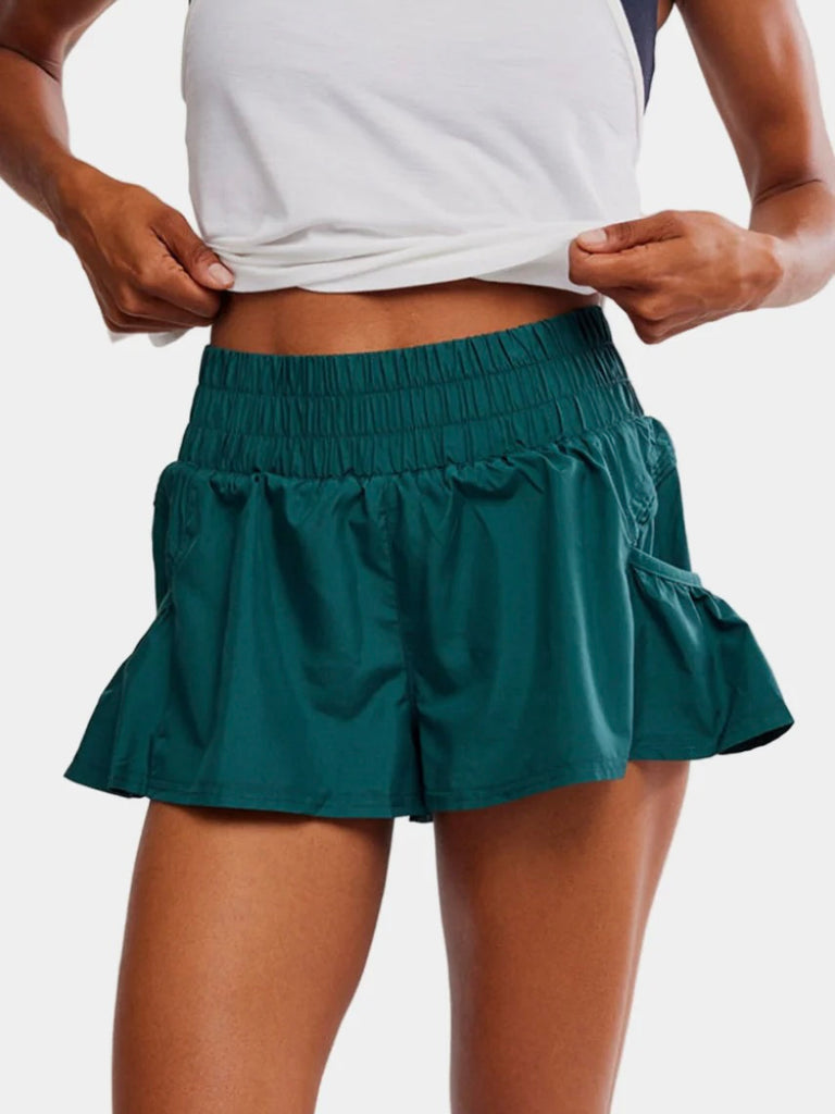 So flirty and fun shorts to spice up your workout attire, featured in a flowy style with a high-rise, smocked waistband and side pockets.