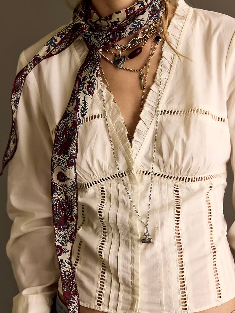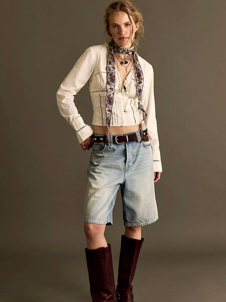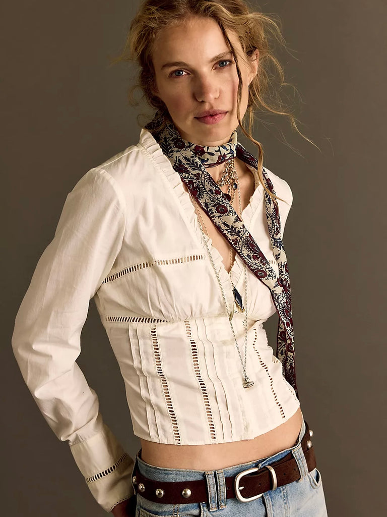 Effortlessly transform any ensemble with this corset-inspired top, featuring an elegant empire waist silhouette, delicate embroidered details, and classic cuffed sleeves for a timeless touch.