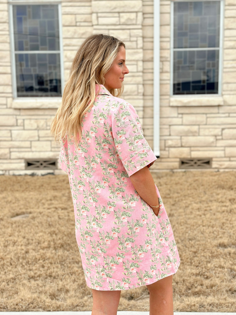 The Entro Denim Floral Mini Dress in pink features a 97% cotton and 3% spandex blend, providing both comfort and stretch. The inner lining enhances wearability, while the rose pattern and collared design add a touch of elegance. With a button closure and short sleeves, this dress is ideal for casual occasions.