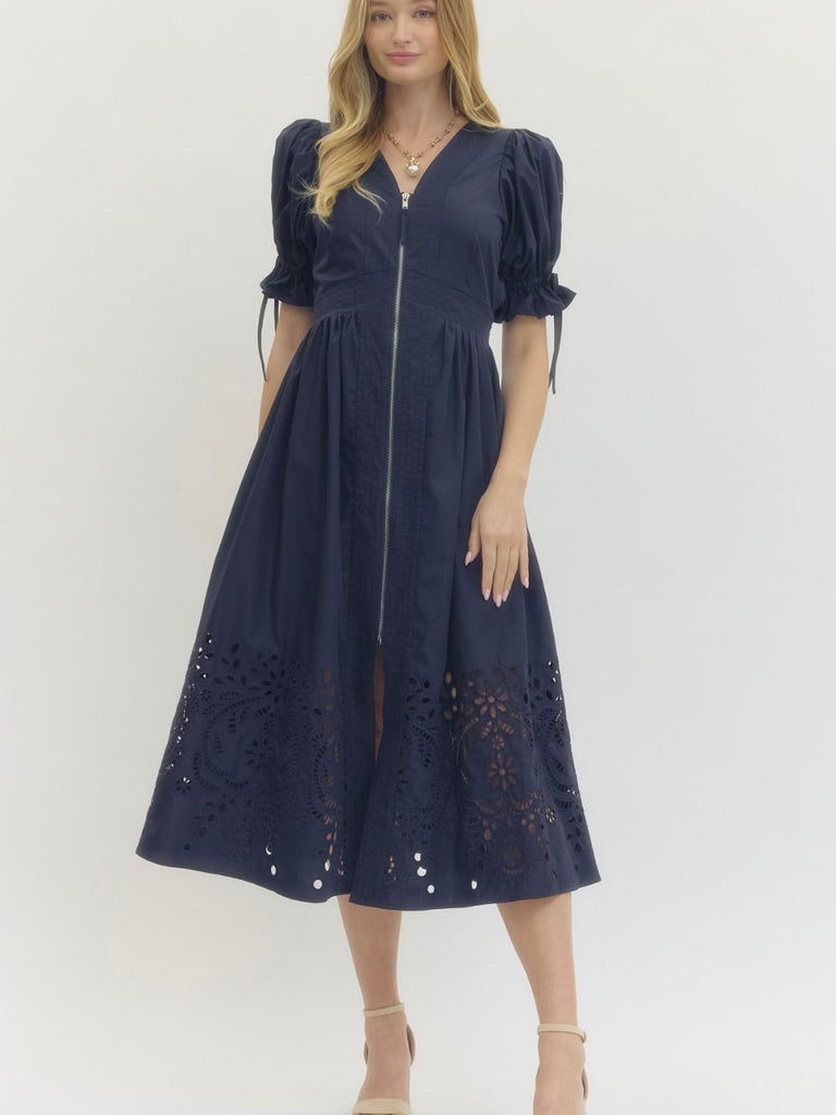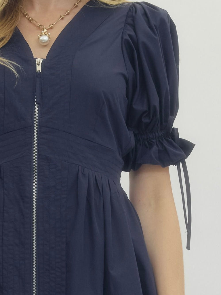 Entro Puff Sleeve Midi Dress - Navy Blue