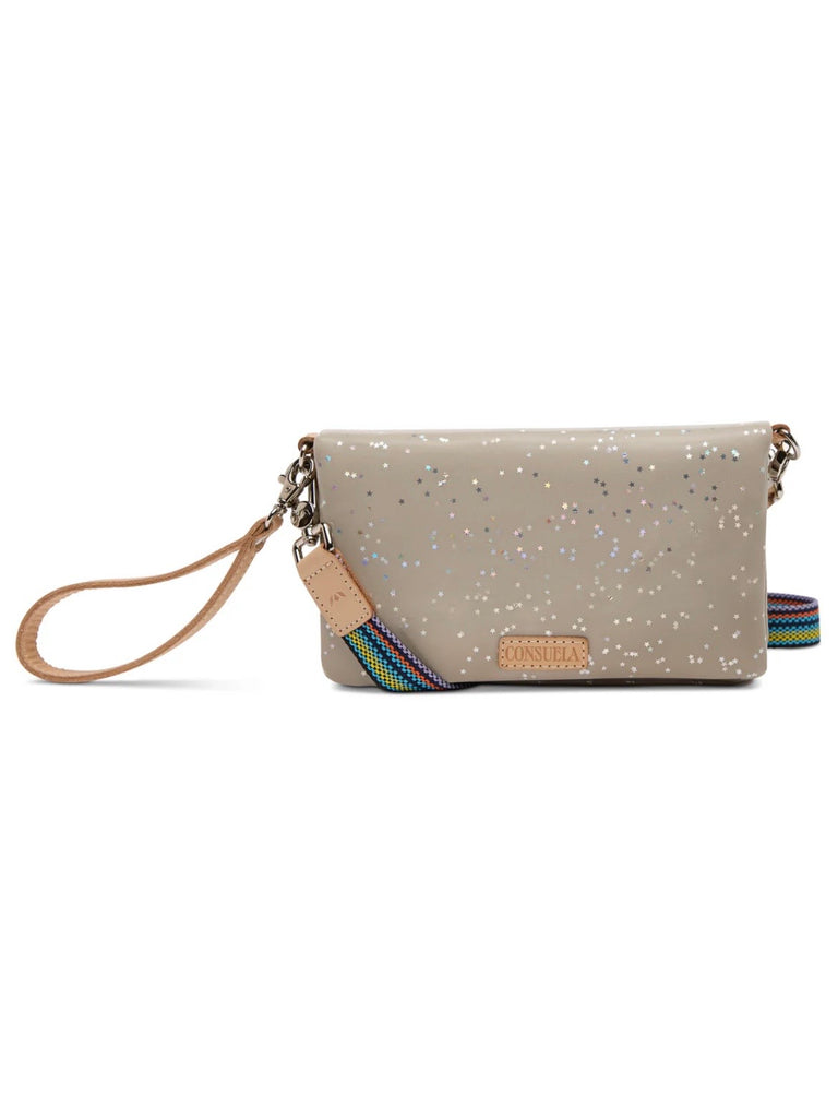 - Included detachable wristlet strap and adjustable woven crossbody strap