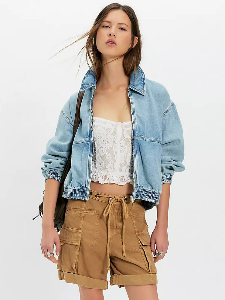 The perfect throw-on-the-go design, this denim jacket from our We The Free collection features a lightweight cotton fabrication, a classic bomber silhouette, and a collared neckline for a timeless touch.