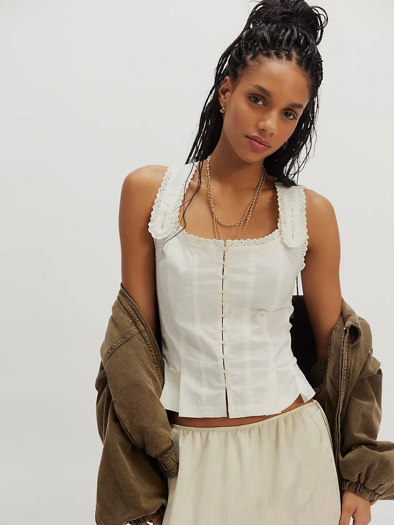 Step into a world of ethereal design with this vintage-inspired top, featuring a flattering, corset-style silhouette, a lightweight cotton fabrication, and a dainty embroidered trim for a sweet touch.