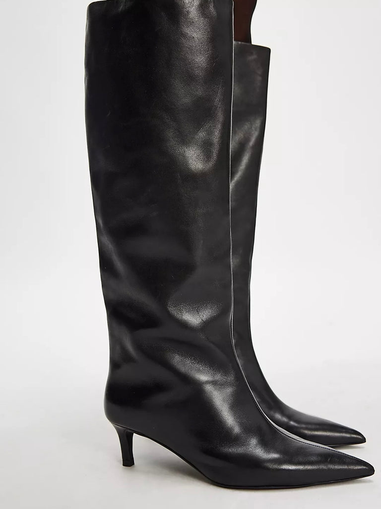 Simple yet chic, these timeless tall boots feature buttery soft leather and a bold pointed toe with a minimal kitten heel and easy pull-on style.