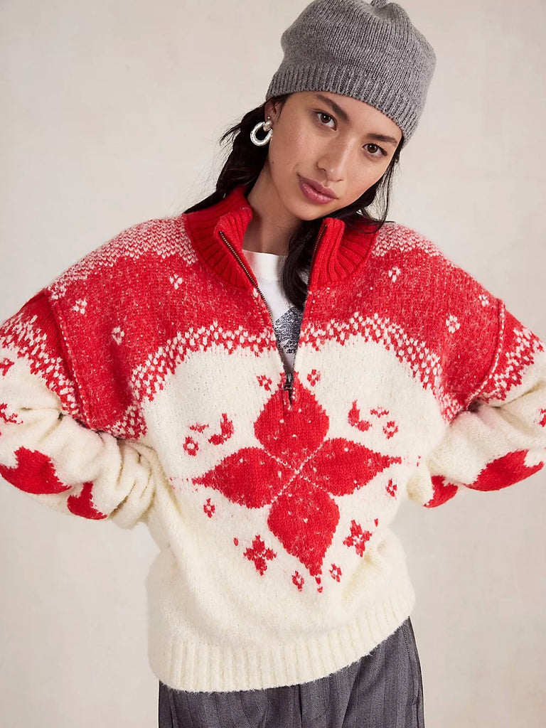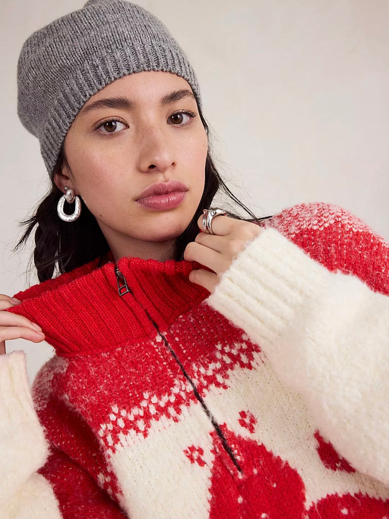 Cozy nights and festive feels, this slouchy sweater features a soft knit fabrication and an oversized, quarter-zip-inspired silhouette, creating the perfect laidback layer.